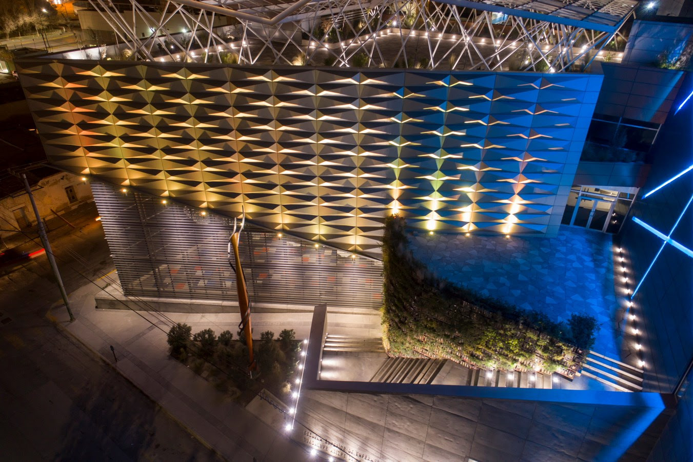 The building is bold, expressive, with urban scaled textures and geometry. Nested in a desert environment, the design is sustainable and resource conscious. Uses passive technologies that help reduce heat gain, ventilated facades, louvers, insulation, and efficient low-e glassing.
